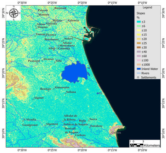 Slope map of the Valencia Metropolitan Area and surrounding regions including its hydrology and settlements. The slope gradients, derived from digital DEM data [43], are presented as percentages (%) and classified into multiple classes.