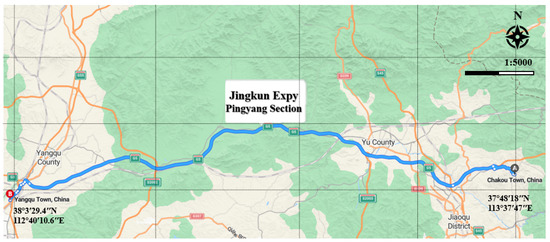 In this study, the constructed dataset is derived from vehicle-mounted LiDAR point cloud data collected along the Pingyang section of the Shanxi Province Expressway. As shown in Figure 1, the Pingyang Expressway section is part of the Jingkun Expressway in China, located between Pingding County and Yangqu County in Taiyuan City, Shanxi Province. It is commonly referred to as the “Pingyang Section”. The route begins east of Shenshuiquan in Chankou Town, Pingding County, connecting to the Hebei section of the Jingkun Expressway. It passes through the suburban district of Yangquan City, Yuxian County, Yangqu County, and Jiancaoping District of Taiyuan City, and ends northwest of Beishantou Village in Yangqu Town, Jiancaoping District, where it connects with the original Taiyuan Expressway and the Northwest Ring Expressway of Taiyuan. This expressway is a dual six-lane highway crossing the Taihang Mountains and is situated at the intersection of plains, low hills, and high mountainous terrain.