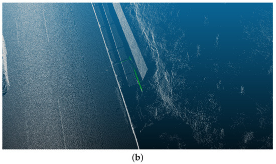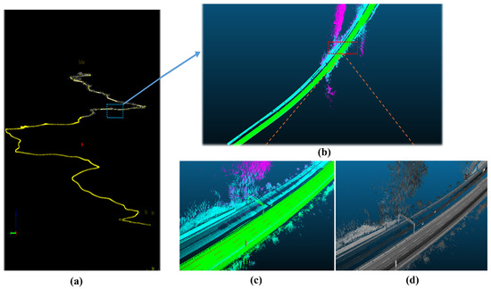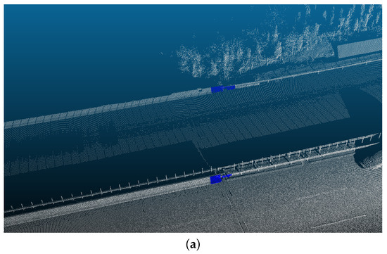 The LiDAR equipment used is the HiScan-C SU1 3D Mobile Mapping System, which offers high accuracy, dense point clouds, excellent object recognition, and precise measurements. Figure 2a presents an oblique view of the Pingyang section of the Jingkun Expressway. Figure 2b highlights a representative segment that contains most categories of roadside assets. In Figure 2c, point cloud intensity values are visualized as a scalar field using the CloudCompare software (v2.11.1), with standard color rendering applied to depict road surfaces and roadside objects. This visualization leverages differences in material reflectivity, which aids in the identification of object types. Figure 2d also visualizes the point cloud intensity as a scalar field, but rendered in grayscale mode, allowing clearer observation of real surface textures, fine edges, linear structures, cracks, and boundary lines. Data acquisition was scheduled on weekday mornings under favorable weather conditions to minimize the impact of environmental and traffic factors on the data quality. Figure 3 shows a horizontal view of the complete point cloud dataset collected.