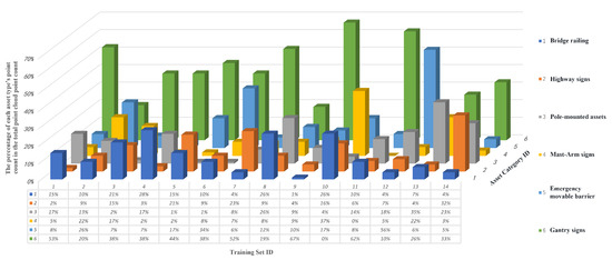 Each category reflects different structural characteristics and engineering technical requirements on highways. This classification helps in more detailed consideration during the planning, maintenance, and management of highways. Figure 6a provides a detailed display of the specific quantity of each type of road surface, and Figure 6b shows the proportion of each road surface type in the total data. Figure 7 shows the distribution of asset points in each segment of the training set, with the X-axis representing ’Training Set ID’, the Y-axis representing ’Asset Category ID’, and the Z-axis indicating ’The percentage of each asset type’s point count in the total point cloud count’. The classification of road surfaces shows that standard roadways and bridges occupy the vast majority of the highway, hence our study also focuses on this part.