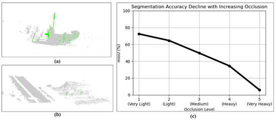 Figure 11 shows the performance degradation under increasing occlusion levels. Subfigures (a) and (b) present two example segments with different occlusion intensities. Green points represent correctly segmented pole-mounted assets. It is evident that severe vegetation coverage leads to point loss and reduced detection accuracy. The curve in (c) shows a clear declining trend in segmentation performance (mIoU) as occlusion becomes heavier, confirming the sensitivity of the model to occlusion-related density loss and geometric ambiguity.