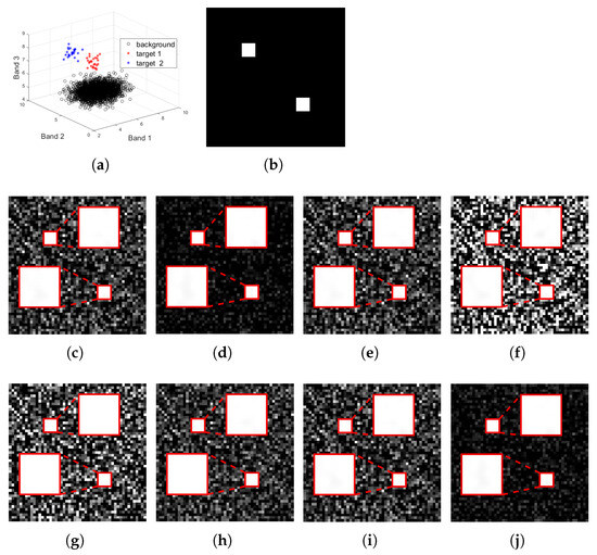 Target detection results for the simulated data with a size of : (a): the distribution of the simulation image in three-dimensional spectral space, where the background pixels are marked in a black circle, and the targets are marked with red and blue asterisks; (b): the groundtruth image for the target and ; the detection result of (c) MTCEM where , (d) MTMF where , (e) MTR1 where , and (f) MTR2 where , (g) SCEM, (h) WTACEM, and (i) RMTCEM, respectively; (j): the detection result of MTCE ().
