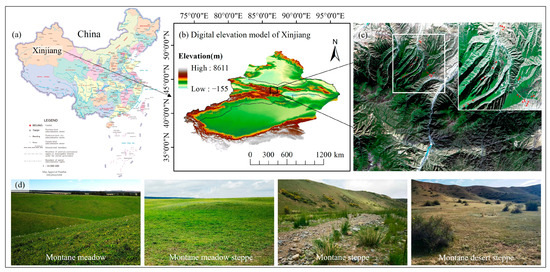 Overview of the study area. (a) Location of Xinjiang; (b) digital elevation model of Xinjiang with 30 m resolution (the rectangular frame in the figure indicates the location of the study area); (c) the distribution map of sampling points set up along the altitude vertical zone in the middle section of the Tianshan Mountains; (d) the four main types of grassland in the study area.