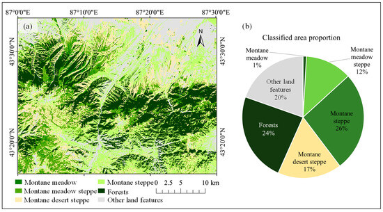 (a) Land cover classification; (b) the area proportion of the four types of sampled grasslands and other land features.
