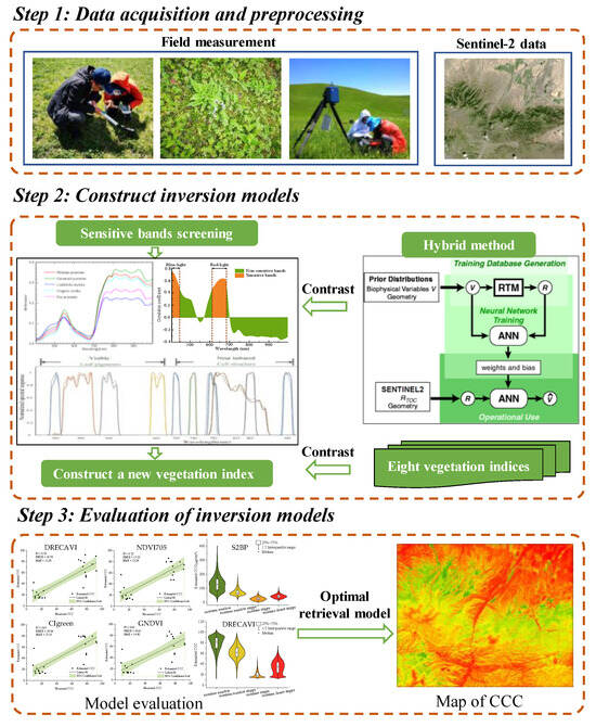The workflow of retrieving CCC in mountainous heterogeneous grasslands using ground hyperspectral and Sentinel-2 data (for hybrid model diagram, refer to [60]).