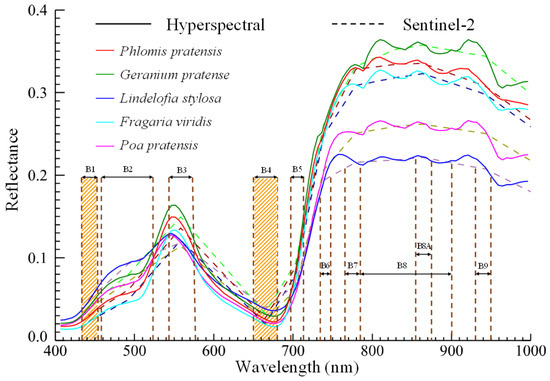 Five typical plants’ ground-measured hyperspectral curves (solid lines) and the simulated Sentinel-2 reflectance curves (dashed lines). The orange-red striped areas indicate the ranges of chlorophyll-sensitive bands. The different spectral bands of Sentinel-2 are designated as B1, B2, B3, etc.