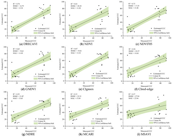 In this study, the measured CCC served as the dependent variable, while VIs were used as the independent variables. Six regression algorithms were employed to construct CCC estimation models. The optimal model was selected based on the highest R2 value (Table 5). The results demonstrated that most VIs exhibited quadratic or cubic relationships with CCC. Among all models, the regression model incorporating the DRECAVI as the independent variable achieved the best performance, with an R2 value of 0.75. The order of goodness of fit between the CCC and VIs was as follows: DRECAVI > NDVI705 > CIgreen > NDVI/GNDVI > NDRE > CIred-edge > MCARI > MSAVI.