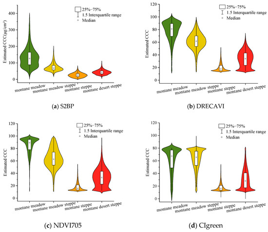 Comparison of the distribution characteristics of the CCC inversion results for four types of grasslands: (a) The violin plot of the S2BP based on the SNAP; (b) the violin plot of DRECAVI; (c) the violin plot of NDVI705; (d) the violin plot of GIgreen. The violin plot shows the median, upper and lower quartiles, and upper and lower extreme values, and the breadth of the graph signifies the concentration of data points across various values.