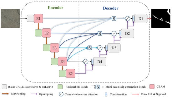 As Figure 2 illustrates, the structure of the proposed IEDSSNet is similar to U-Net, as both adopt an encoder–decoder architecture. To enhance the network’s ability to extract effective crack features in complex backgrounds, we integrated residual squeeze-and-excitation (SE) blocks and convolutional block attention module (CBAM) blocks into the encoder. Additionally, to narrow the semantic gap between encoder and decoder features, traditional skip connection blocks were replaced with multi-scale skip connection blocks, and channel-wise cross attention blocks were incorporated into the decoder. Specific details were introduced in Section 2.2.1 and Section 2.2.2.