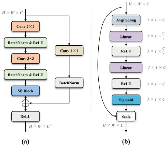 The residual SE block combines the SE attention mechanism with the residual block, as illustrated in Figure 4. Initially, two 3 × 3 convolution operations with BatchNorm and ReLU activation extract semantic features from the input feature map. Subsequently, the SE block enhances the input feature map, while simultaneously, the original feature map undergoes a 1 × 1 convolution and BatchNorm operation. The final output feature map is obtained by adding the two feature maps and applying ReLU activation. This standard residual block facilitates direct gradient flow through the shorter path, alleviating the vanishing gradient issue during training [29].