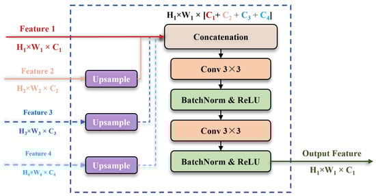 The new skip connection block can accept 2 to 4 features as input, leading to enhanced feature representation. Within our network, we designate the low-scale feature (Feature 1) as the reference. By aligning the spatial dimensions of other input features to it and concatenating the feature maps along the channel dimension, we generate a multi-scale feature with spatial dimensions of and a maximum channel depth of + + + . Subsequently, through two convolutional operations, BatchNorm, and ReLU activation, we adjust the channel depth to match the reference feature . The skip connection approach integrates both shallow and deep abstract features, facilitating simultaneous consideration of local details and broader contextual information. This strategy helps narrow semantic gap between encoder and decoder features.