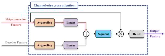 Additionally, we integrated a channel-wise cross attention block into the decoder to fuse multi-scale skip connection features with decoder features, further reducing semantic-level inconsistencies [26]. As shown in Figure 6, this block takes the fused features from multi-scale skip connections and corresponding features from the decoder stage as input, producing fused features as output. Initially, input features undergo spatial compression through global average pooling, reducing feature map dimensions to (1,1,C). These features are then nonlinearly transformed into channel attention via a linear layer. Subsequently, the channel attention of both features is fused through addition, and a sigmoid activation function is used to map the fused attention to attention weights. Finally, the input skip connection features are multiplied by attention weights and passed through a ReLU activation function to generate the output features. The channel-wise cross attention block is based on decoder features to guide channel and information filtering of multi-scale skip connection features, thereby reducing ambiguity between the skip connection features and decoder features.