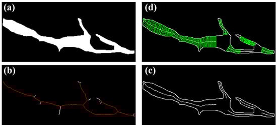 Due to the uncertainty in measuring the width at crack bifurcations, we exclude crack pixels within the maximum inscribed circle centered at the skeleton bifurcations. Figure 7c shows the crack edges and skeleton after removing intersecting regions. We use a hybrid method by Ong et al. [34] for width measurement. This method combines shortest projection and orthogonal to identify point pairs achieving the shortest distance orthogonal to the skeleton. The green lines in Figure 7d represent multiple width measurements obtained by this method. We average these green lines to determine the crack width. After measuring the length and width of all cracks, we convert them to real distances by multiplying them with the DOM spatial resolution. Finally, using the rasterio library in the Python 3.8.5 environment, we convert the crack mask into polygon vectors and add the measured crack length and width as attributes to the vectors. The resulting crack inventory aids in data visualization, management, and decision-making for prevention and control.