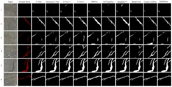 Results of different models. From left to right: original image; ground truth; U-Net; Attention U-Net; U-Net++; U-Net3+; PSPNet; UCTransNet; Deeplabv3+; DeepCrack; Crack-CADNet; IEDSSNet. Numbers 1–6 denote crack sample identifiers.