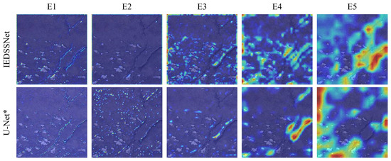 To highlight the advantages brought by the improvement blocks to the proposed IEDSSNet, we performed a visual analysis using attention maps, encoder and decoder feature maps. The encoder was augmented with residual SE blocks and CBAM blocks to aid the model in focusing on crack feature extraction. To illustrate the impact of the improved encoder, attention maps for each stage of both the U-Net* baseline model and the enhanced encoder were visualized, as shown in Figure 10. It is evident that the primary features (E1, E2) of both models focus on more localized and detailed features, such as crack edges and textures. As the network layers deepen, attention gradually shifts towards more global and semantic features, such as crack shape and size. The enhanced encoder primarily focuses on crack edges, whereas U-Net* primarily captures noisy texture features from other complex backgrounds. Moreover, high-level features extracted by the enhanced encoder gradually converge on the crack area, while U-Net* exhibits notably poorer attention towards the overall shape and size of cracks. This implies that our enhancement method is more effective in preserving detailed information, such as crack edges, while also better understanding the overall semantics and structure of cracks.