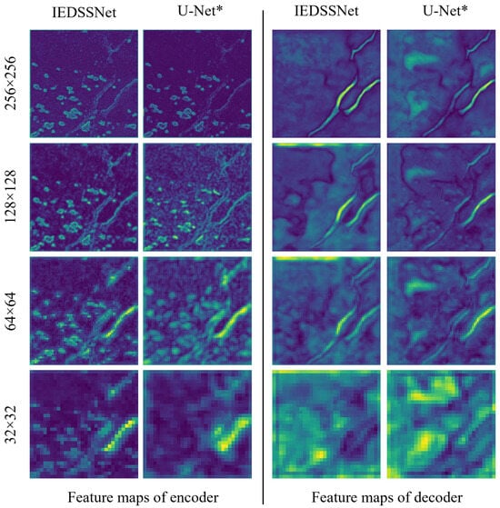 Visualization and comparison of feature maps between U-Net* and IEDSSNet.