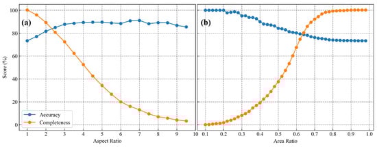 Accuracy and completeness under different filtering thresholds. (a) Aspect ratio; (b) area ratio.
