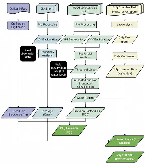 Space-based rice paddy products are crucial in mapping the spatial distribution of CH4 emissions and have been widely explored in many studies across Asia [12,13,14,15,26,27,28,29,30]. For instance, the Mekong Delta, Vietnam, has been studied the potential of ALOS-2 PALSAR-2 for differentiating inundated and non-inundated paddy fields for methane calculations [12]. In Korea, satellite data has been used for methane calculation using IPCC guidelines [13]. Similar efforts have been conducted in China and Thailand to evaluate emission variability under varying water regimes and cultivation practices [14,15].