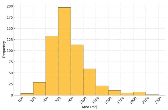 A total of 580 rice field parcels (50 ha) were identified, and their areas were calculated based on high-resolution imagery. Figure 4 shows the distribution of parcel sizes in square meters. The mean field area is 871 m2, and the median is 817 m2, indicating a relatively symmetrical distribution. Parcel sizes range from 178 m2 to 2268 m2, with a standard deviation of 299 m2. Most fields are clustered around the mean, with variation likely influenced by land ownership patterns and local agricultural practices. The selected AWD parcels measured 1961 m2 and 2922 m2, while the CF parcel measured 603 m2.
