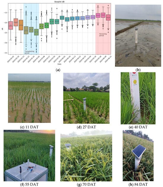 (a) VH backscatter values of Sentinel-1 in all parcels rice field from February to June 2024 to identify transplanting (in blue shading) and harvesting periods (in pink shading), (b) The field preparation on 23 February 2024, (c) The rice field condition 11 days after transplanting (DAT) on 4 March 2024, (d–f) The vegetative stages (27, 40, and 55 DAT) on 21 March 2024, 3 April 2024, and 18 April 2024, respectively, (g,h) The generative stages (70 and 84 DAT) on 3 May and 13 May 2024, respectively. The example of an installed IoT device is shown in figure (h).