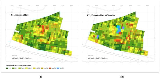 The integration of high-resolution imagery and chamber-based flux measurements enables precise, spatially explicit estimation of CH4 emissions at the parcel level. Using 30 cm resolution Google Earth imagery, we accurately delineated individual rice fields, including the narrow “pematang” boundaries characteristic of smallholder landscapes. This detailed mapping ensures that the area variable in the emission equations reflects the actual size of each parcel. Meanwhile, chamber measurements were conducted within these same delineated parcels, allowing the local emission factor to represent field-specific conditions. Because both area and emission factor data are derived at the same spatial resolution, they can be directly integrated in Equations (4) and (6) to estimate methane emissions for each parcel. This spatial alignment preserves local variability in field boundaries and emission rates, which is essential for accurately identifying emission hotspots and understanding the effects of different management practices. By combining high-resolution parcel mapping with localized emission factors, our approach effectively captures the spatial heterogeneity of CH4 emissions across the study area.