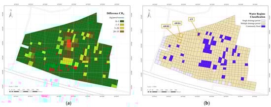 Figure 11 presents the spatial distribution of CH4 emission differences between national and local emission factors (Figure 11a) to the water regime classification of the study area (Figure 11b). The emission differences vary across the field, with higher emission (20–35 kg CH4/parcel/season) observed predominantly in areas under CF, as indicated by the red zones in Figure 11a. In contrast, fields managed under AWD regimes, particularly AWD1 and AWD2, exhibit lower CH4 emission differences, primarily within the 0–5 kg CH4/parcel/season range (dark green and light green zones).