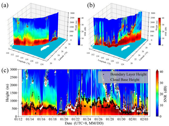 SNR detected by CDWL. (a) SNR during the northbound cruise; (b) SNR during the southbound cruise; (c) SNR, BLH, and cloud base height during the overall cruise. (Light blue on the map background indicates seawater areas, and white indicates land areas).