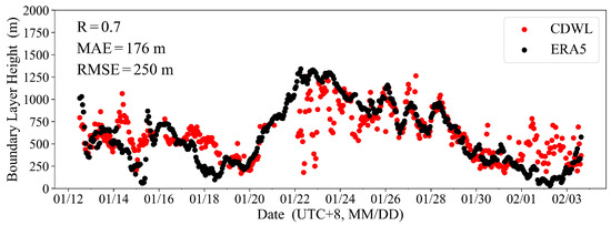 Based on the BLH development characteristics captured by the CDWL in different regions, further analysis was conducted in conjunction with ERA5 reanalysis data. Firstly, using the actual BLH results from the CDWL as a benchmark, the accuracy of the ERA5 reanalysis data during the cruise period was evaluated. The 10 min average BLH of CDWL was averaged into hourly results and compared with ERA5 data at the hourly navigation location grid point. The BLHs at the grid points where the CDWL was located during the cruise were extracted, and the hourly average BLHs from the CDWL were compared with those from ERA5 (Figure 3). The BLHs of the ERA5 reanalysis results were consistent with the trends detected by the CDWL, with a correlation coefficient R of 0.7. This result indicates that the ERA5 reanalysis data have a certain reliability in describing variations in BLH. However, the mean absolute error (MAE) was 176 m and the root-mean-square error (RMSE) was 250 m. The reason for this discrepancy lies in the fact that the CDWL retrieves the material BLH using the SNR gradient method, while ERA5 retrieves the dynamic BLH using the Richardson number threshold method. There are inherent differences between the two methods. Additionally, the CDWL was influenced by the height distribution of aerosol particles within the boundary layer (such as from 26 January to 28 January), as well as sea fog and low clouds (such as from 19 January to 22 January, and 29 January to 3 February), which leads to significant changes in the BLH results retrieved by the CDWL. During these periods, the ERA5 BLHs do not fully align with the CDWL observations. Even though these differences exist, the BLH data provided by ERA5 can still be used to analyze the characteristics of BLH due to its extensive coverage and high temporal resolution.