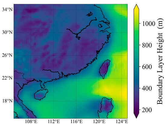 The regional distribution of the mean BLH from ERA5 during the overall cruise period is shown in Figure 5. In southeastern China, the winter MABL height is generally higher than that over land, indicating spatial differences in BLH [20,21].