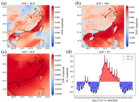 In this study, we focused on analyzing EOF1 and EOF2 (Figure 7 and Figure 8), the two primary modes during the winter. As shown in Figure 7, EOF1 reveals that there are spatial differences in the EOF amplitudes of BLH, with strong positive amplitudes over the near-shore marine areas and weak positive and negative amplitudes over land. The SHF over the near-shore marine regions is relatively consistent with BLH. The coastal areas display strong positive amplitudes for SLP, indicating that strong weather systems primarily affect the coastal regions, where the variations in SLP are more pronounced. The Time coefficient PC shows positive high values during the period of 21 January to 29 January, corresponding to the weather process of strong cold air transit. During this period, the SLP in the coastal areas significantly increased under the influence of strong cold air. Due to the high heat capacity of the ocean, the sea surface temperature is less affected by strong cold air, and the SHF in near-shore coastal areas is higher, favoring the development of BLH. However, the low heat capacity of land means that the land surface temperature is more susceptible to weather system influences and decreases, which results in smaller SHF, weaker land–air heat exchange, and lower BLH. Meanwhile, the subsidence motion may inhibit the development of the boundary layer.