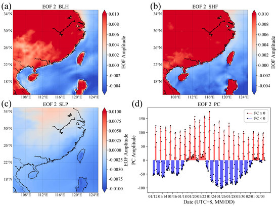 Figure 8 shows that the EOF2 amplitudes of BLH are positive in most regions, with higher amplitudes over land and lower amplitudes over the sea. This indicates that within the study area of this mode, the BLH generally exhibits a consistent trend of variation. However, the BLH changes more rapidly over land than over sea, while the changes over the sea are not significant. The SHF shows a trend consistent with the BLH, suggesting that when SHF increases more rapidly, BLH also rises faster. Conversely, when SHF decreases more rapidly, BLH also falls faster. This mode reflects a weak weather system background, as indicated by the SLP. Under the background of a weak weather system, the Time coefficient PC shows positive high values from 11:00 to 16:00 daily (UTC + 8). This suggests that the atmospheric boundary layer over land develops faster in the afternoon with higher BLHs, under the influence of solar radiation. In contrast, the changes in marine atmospheric BLH are relatively slower. During other periods, negative PC values suggest a faster decrease in land atmospheric BLH, while marine atmospheric BLH maintains relatively stable values.