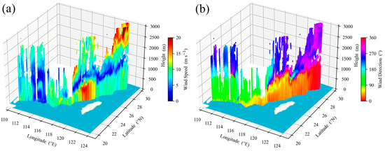 (a) Wind speed and (b) direction detected by CDWL. (The light blue map background indicates seawater areas, and white indicates land areas).