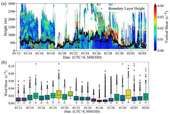 Wind shear detected by CDWL. (a) Wind shear; (b) Wind shear within the boundary layer. (The middle line of the box represents the median value of daily wind shear within the boundary layer, the box represents the interquartile range of wind shear within the boundary layer, the upper and lower edges of the box whiskers represent the normal distribution range of wind shear within the boundary layer, data points outside the upper and lower edges represent daily wind shear outliers within the boundary layer, and the color of the box represents the magnitude of the mean wind shear within the boundary layer, with cool colors indicating smaller means and warm colors indicating larger means).