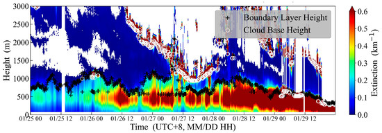 The aerosol extinction coefficient serves as a reliable proxy for particulate matter (e.g., PM2.5) concentrations [23]. CDWL could also retrieve the aerosol extinction coefficient based on several assumptions, such as lidar ratio, boundary value, or reference height. It should be emphasized that the CDWL-retrieved aerosol optical properties must be calibrated by the collocated reference instruments, such as Raman lidars [24], high-spectral resolution lidar, or sun photometer [24,25]. The iteration algorithms, calibrated with collocated sun photometer, were incorporated into the CDWL employed in this study to derive the aerosol extinction coefficient [25]. During the southbound cruise, CDWL detected a significant pollution episode (from 01/25 to 01/29. Subsequently, this pollution episode was removed by wet precipitation), with vertical profiles of extinction coefficients shown in Figure 11. The vertical distribution characteristics of the extinction coefficients indicate that pollutants are confined within the MABL.