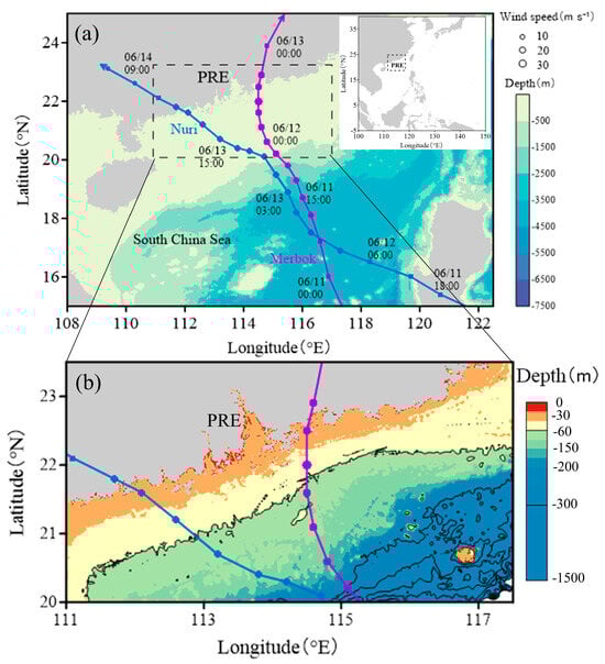 The highly active frontal activity in the northern South China Sea (NSCS), including the Pearl River Estuary (PRE) region plays an extremely important role in regulating the distribution of chlorophyll in this region [,,]. Particularly, the strength of frontal activity directly affects the lateral transport of nutrients and chlorophyll offshore []. Additionally, the NSCS is the area with frequent typhoons. According to statistics, up to 10 typhoons have a direct or indirect impact on the region in one year [], making it an ideal area for studying the effects of typhoons on frontal activities and ocean productivity. Therefore, we speculate that different intensities and tracks of typhoons may alter the movement process of water masses in the PRE, thereby enhancing or weakening or even moving the frontal activity and affecting the local distribution of chlorophyll in the region. In this study, based on the pre-typhoon and post-typhoon frontal positions along the coast, we divided nearshore (<60 m) and offshore (>60 m) using the 60 isobaths (Figure 1b). Two typhoons, namely Merbok (2017) and Nuri (2020), which landed on the right and left sides of the PRE in the NSCS, respectively (Figure 1), were investigated to study their impact on the frontal activities and marine productivity in the PRE and its adjacent waters.