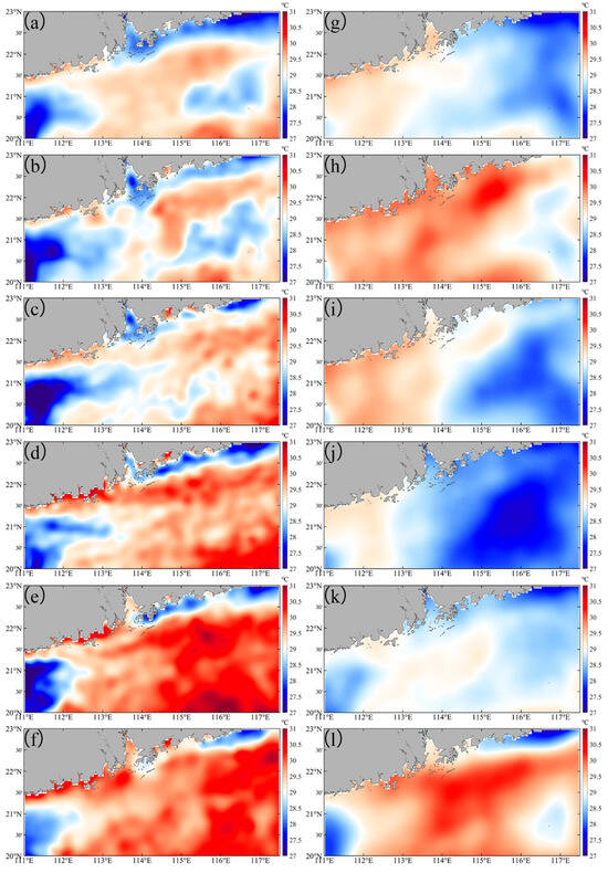 The SST in the study area before and after Typhoon Nuri (2020) (a–f) and Merbok (2017) (g–l). (a,g) are daily averaged data over one week before typhoon. (b–f) are, respectively, first day, day 4, day 7, day 14, and day 21 after Typhoon Nuri (2020). (h–l) are, respectively, first day, day 4, day 7, day 14, and day 21 after Typhoon Merbok (2017).