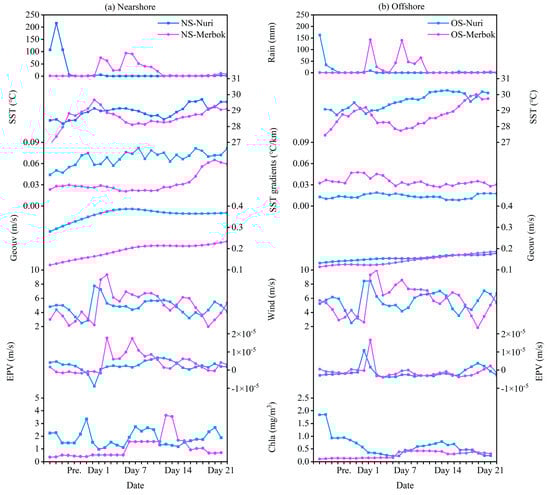 Spatiotemporal variability in the rainfall, SST, SST gradients, geostrophic currents, wind, EPV, and chlorophyll at the nearshore (NS) and offshore (OS) areas in the eastern PRE before and after typhoons Nuri (2020) and Merbok (2017).