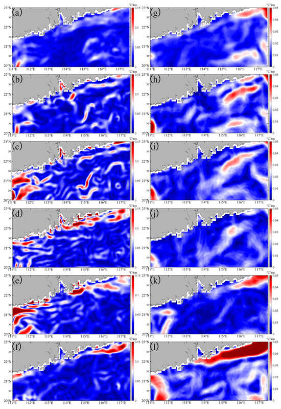 Recently, there has yet to be a uniform standard for the threshold of thermal fronts. There are significant changes in the threshold for selecting SST gradients as fronts in different sea areas, such as the Yellow Sea, the northwest of the South China Sea, and the East China Sea [,,,,]. Based on previous studies, this study selects an SST gradient greater than 0.025 °C km−1 as the frontal threshold in the NSCS. The continental shelf fronts in China’s coastal areas (such as the northern Jiangsu coastal front, the Fujian Zhejiang coastal front, and the NSCS) typically exhibit moderate to weak intensity (strong in winter and weak in summer) [,,,,]. This threshold is a commonly used threshold range for identifying such fronts, and the sensitivity analysis results of this threshold show that the coefficient of variation (CV) of the frequency of front occurrence is <8% between the thresholds [,,,,]. In this study, after the typhoon, most of the values below 0.08 °C km−1 are associated with Typhoon Nuri (2020), with no such values observed during the period of Typhoon Merbok (2017).