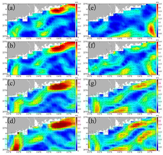 The geostrophic current in the study area before and after the Typhoon Nuri (2020) (a–d) and Merbok (2017) (e–h). (a,e) are daily averaged data over one week before the typhoon. (b–d) are, respectively, daily averaged data over first week, second week, and third week after the Typhoon Nuri (2020). (f–h) are, respectively, daily averaged data over first week, second week, and third week after the Typhoon Merbok (2017).