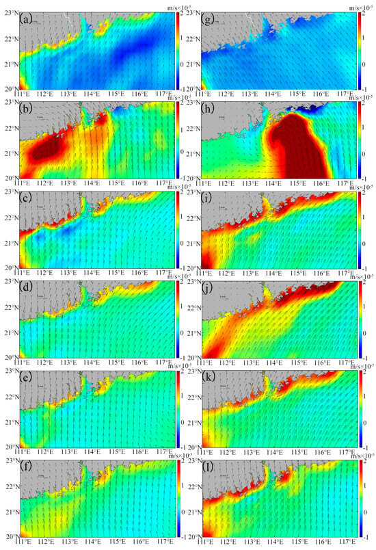 Before Typhoon Nuri (2020), the geostrophic current flowed northeastward along the nearshore of Guangdong Province, with intensified currents observed in the eastern part of the PRE. Meanwhile, an opposite flow occurred in the offshore area (Figure 6a). After Typhoon Nuri (2020), the geostrophic current direction remains similar, but its intensity significantly increased and persisted for approximately three weeks post-landfall (Figure 6b–d). Before Typhoon Merbok (2017), the geostrophic current was similar to that observed during Typhoon Nuri (2020) (Figure 6e). However, in the offshore area of the eastern PRE, the current turned to the offshore region before flowing southwest, opposite to the direction of the nearshore flow (Figure 6e). Similar to Typhoon Nuri (2020), the direction of the geostrophic current after Typhoon Merbok (2017) did not change substantially, but the intensity significantly increased, especially in the nearshore areas (Figure 6f–h). After some days of Typhoon Nuri’s landfall, the intensified geostrophic current coincided with the observed increase in SST (Figure 3b–f), which showed significant positive correlation between them (Figure 7). In addition, the EPV increased in the offshore area (Figure 8b), indicating an upwelling of deeper cold water.