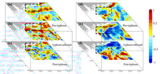 The spatial distribution of the correlation coefficient between SST gradients and chlorophyll at the nearshore areas in the eastern PRE before and after typhoon Nuri (2020) (a–c) and Merbok (2017) (d–f), with r values of −0.26 (p < 0.05), −0.21 (p > 0.05), −0.36 (p < 0.05), −0.53 (p < 0.05), −0.35 (p < 0.05), and −0.49 (p < 0.05), respectively. Asterisks indicate statistically significant (p < 0.05). The dashed boxes indicate edge of the frontal zone.