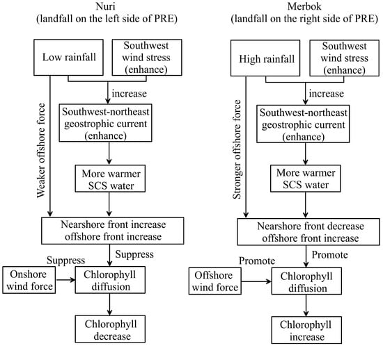 Unlike Typhoon Nuri (2020), there was heavy rainfall in the eastern PRE after the Typhoon Merbok (2017), while minimal rainfall before Typhoon Merbok (2017) (Figure 2e–h). Therefore, the front that formed in the nearshore area of the eastern PRE before Typhoon Merbok hindered the lateral transport of nutrients and chlorophyll-rich water masses, leading to lower chlorophyll concentrations in the region. However, after Typhoon Merbok (2017), as the fronts shifted offshore, the barrier effect of the nearshore front weakened, leading nutrients and chlorophyll-rich waters to be transported to the eastern PRE. Furthermore, Typhoon Merbok (2017)’s landfall on the right side of PRE generated counterclockwise wind stress (offshore wind), promoting the movement of chlorophyll-rich waters from the PRE toward offshore areas []. Heavy rainfall during the typhoon delivered abundant terrestrial nutrients [,,], collectively increasing eastern PRE chlorophyll levels.