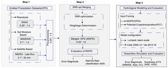 Methodological framework for precipitation merging and hydrological validation.