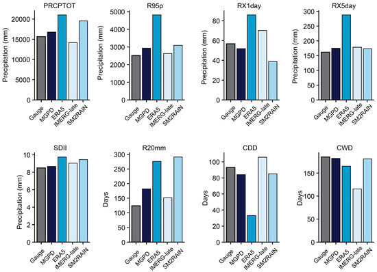 Annual values of eight ETCCDI extreme-precipitation indices (PRCPTOT, R95p, RX1day, RX5day, SDII, R20mm, CDD, CWD) averaged over 2008–2018. Bars show gauge reference and gridded products.