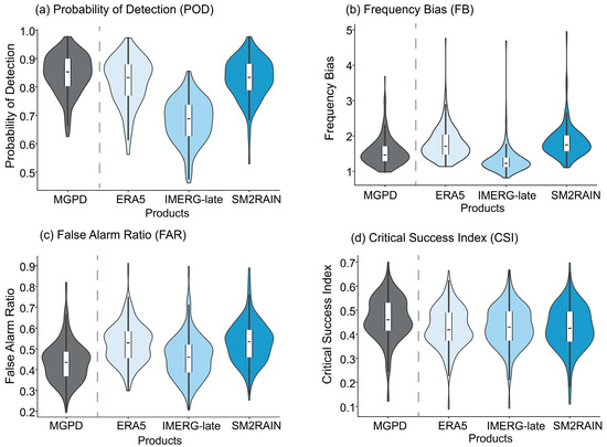 Daily precipitation occurrences, based on a threshold of ≥1 mm, were compared between (M)GPDs and the gauge data to calculate hits, misses, and false alarms. The distributions of these categorical metrics were visualized using violin plots, which effectively capture density trends, interquartile ranges, and median values.