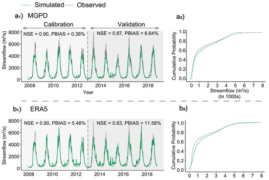 Comparison of simulated (green) and observed (gray) streamflow for four different precipitation forcings: (a1,a2) MGPD, (b1,b2) ERA5, (c1,c2) IMERG-late, and (d1,d2) SM2RAIN in the Narayani Basin. Left panels (a1–d1) show the time-series plots for calibration (left, up to the dashed vertical line) and validation (right). Right panels (a2–d2) show the cumulative distribution functions (CDFs) of streamflow for observed and simulated data.
