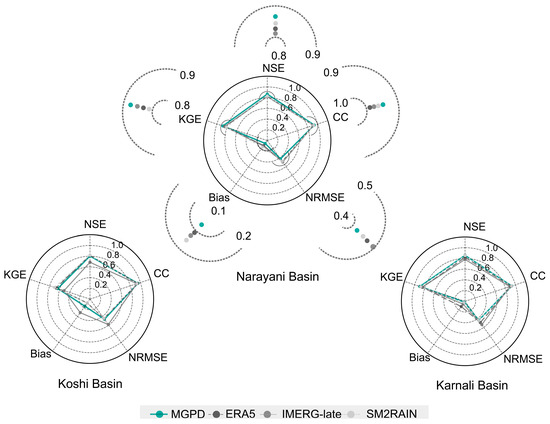 Radar plots comparing the performance of streamflow prediction from precipitation products (MGPD, ERA5, IMERG-late, SM2RAIN) across the Koshi (left), Narayani (centre), and Karnali (right) basins using five metrics: NSE, CC, KGE, Bias, and NRMSE. Each polygon represents a score of the dataset, with concentric rings indicating metric values. Surrounding the Narayani Basin’s central chart are enlarged radial plots focusing on individual metric ranges, offering a closer view of performance differences among the datasets.