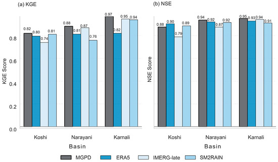 The monthly-flow assessment further supports the validity of MGPD forcings in streamflow simulation. When the performance metrics (NSE and KGE) were evaluated, MGPD retained higher values for all basins, demonstrating that even for different flow intensity and hydrological regimes, it preserves the accurate information of extreme flows better than its parent datasets. Similarly, ERA5 and IMERG-late occupy an intermediate position, which varies according to basin, illustrating how product skill changes with altitude and physiography. Conversely, SM2RAIN yields the lowest NSE and KGE across all basins, reflecting the weakest skill in predicting monthly streamflow. This is because the ASCAT sensor cannot distinguish liquid-water changes when the surface is frozen or insulated by snow, leading to unreliable soil-moisture increments [67]. Furthermore, as SM2RAIN receives the largest weight in the SNR-opt for the moderate rainfall, its mountain-specific errors can influence the merged field when the other parents (e.g., IMERG-late) are weak, explaining the slightly lower NSE of MGPD in the Koshi basin.