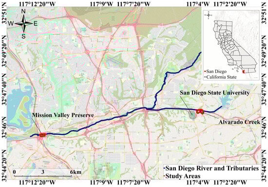 This study focuses on two reaches in the San Diego River watershed, which drains a dense urban area and discharges to a shoreline with recreational beaches. The watershed faces significant environmental challenges from debris originating from storm drains, litter, and unsheltered encampments. San Diego has a Mediterranean climate with mild, wet winters and warm, dry summers. Most (90%) of the precipitation falls between November and April. Despite low average annual rainfall (27 cm), individual storms can be large (>7 cm) [], which exacerbates the risk of flooding and debris loading [].