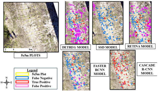 Comparison of object detection results from five deep learning architectures: RetinaNet, SSD, Faster R-CNN, DetReg, and Cascade R-CNN on the same 5 × 5 m ground reference plots from the February 2022 UAV survey at Mission Valley Preserve.
